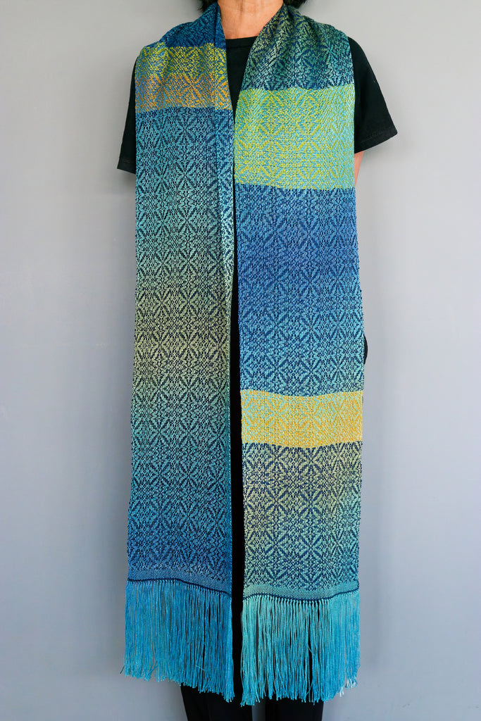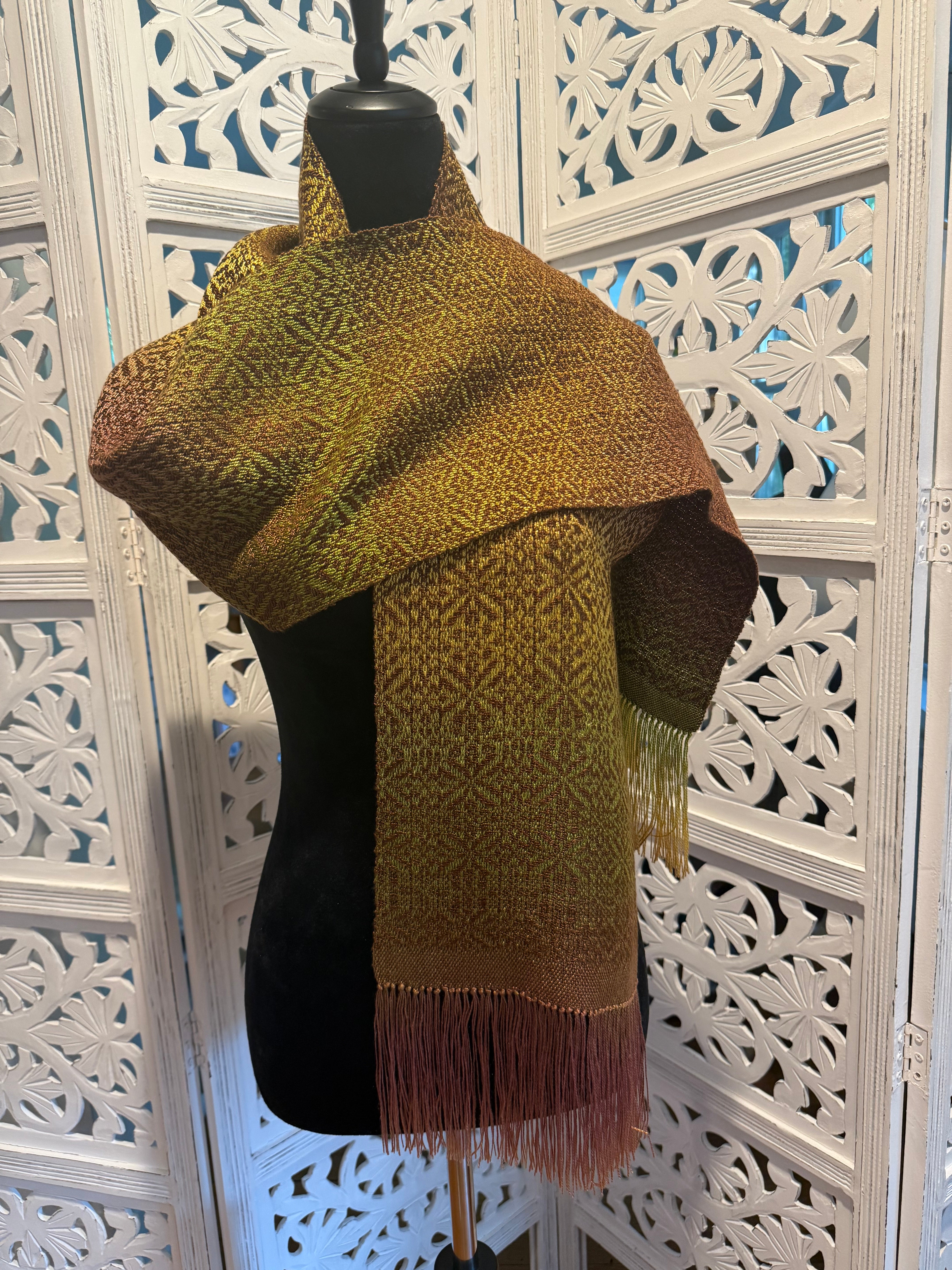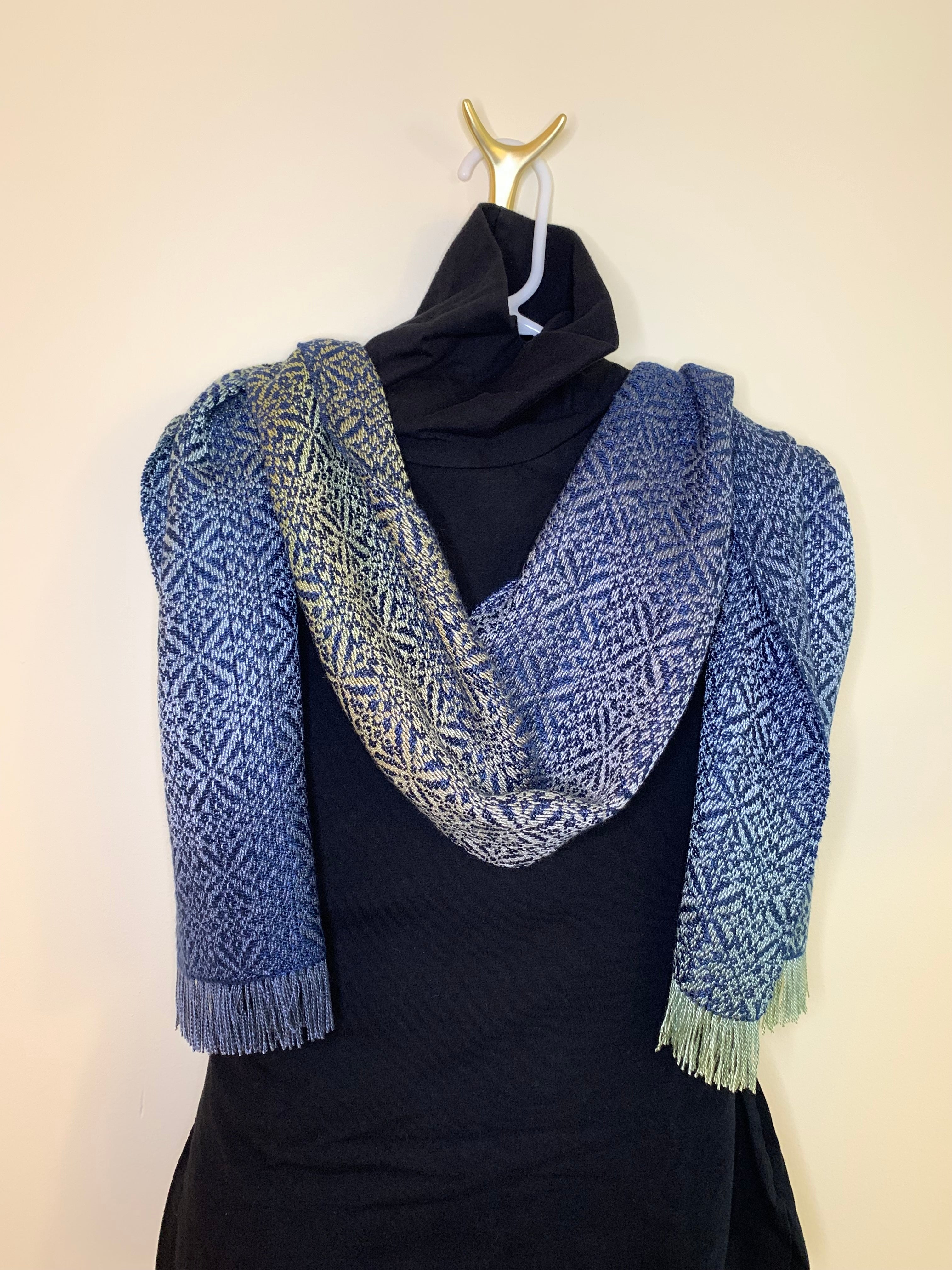 This 4 shaft twill based design is quick to weave up. The painted warp is wound and ready to go on your loom and has enough yardage to weave two scarves, each about 65” long plus fringe!