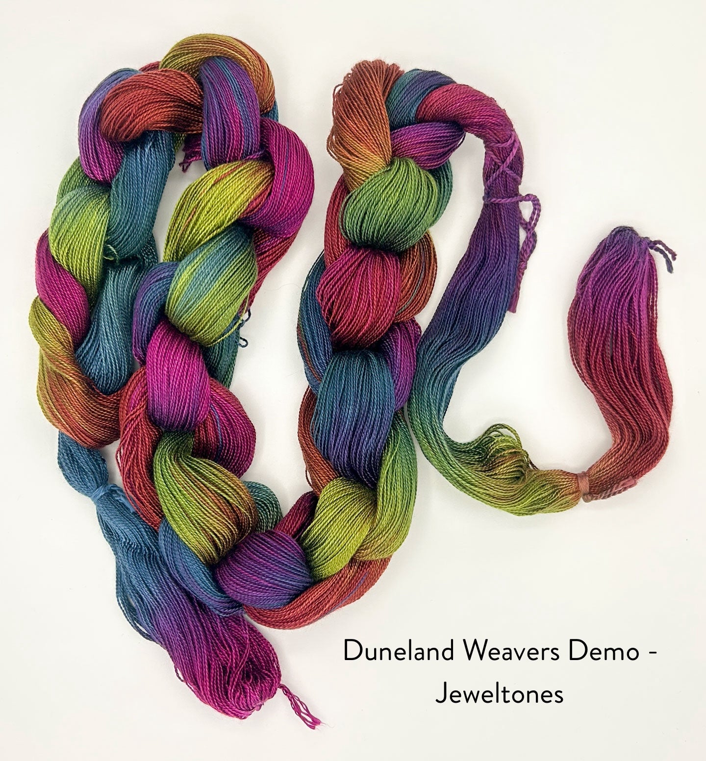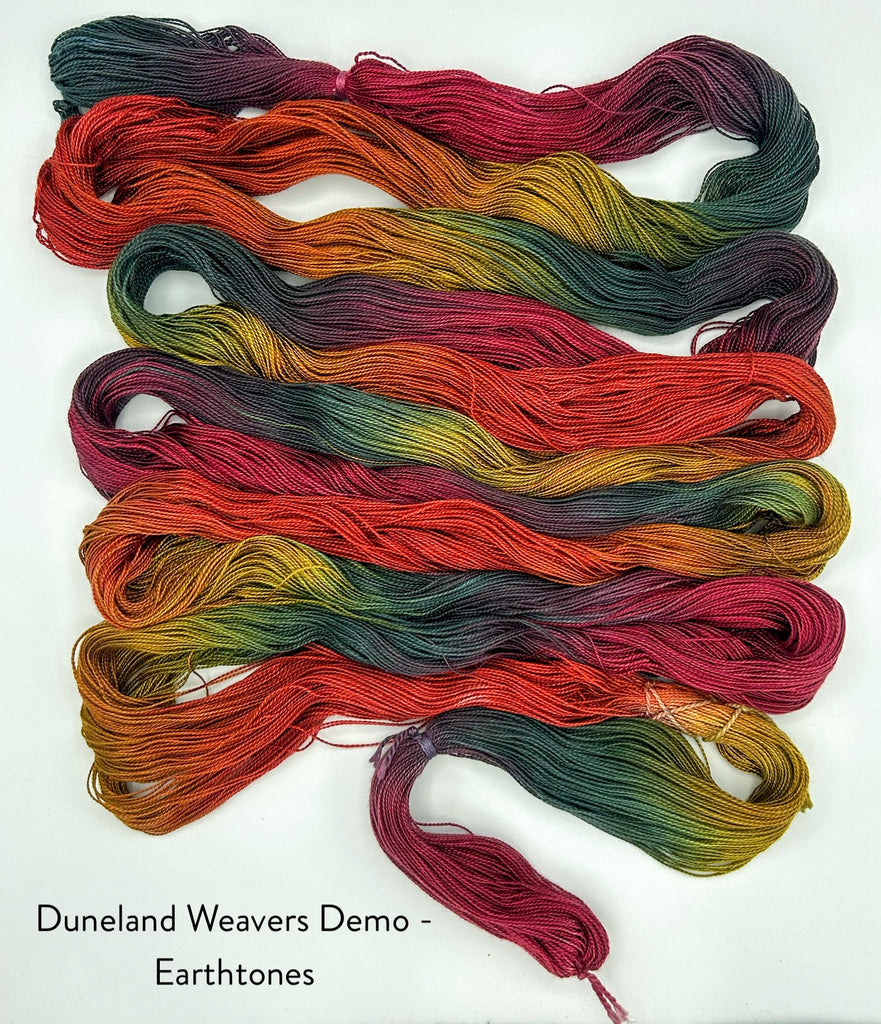 This current set is from Duneland Weavers October workshop. Each one is 5/2 Tencel, 208 ends, 4.5 yards long. This demo yarn shows how primary colors in my dye kit can be toned with the included black or brown dye. Black makes more jeweltone colors; brown makes more earthy colors.